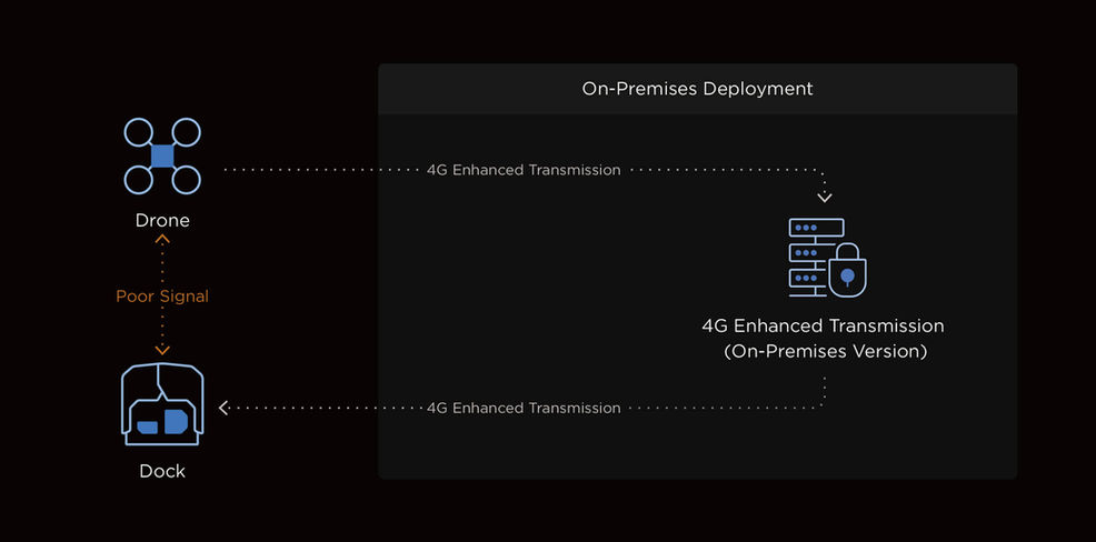La serie Matrice 4D può operare con il radiocomando DJI RC Plus 2 Enterprise per un utilizzo autonomo, integrando una funzione innovativa di ripetitore di segnale. Con questa configurazione, un drone può volare in alto come ripetitore di segnale, permettendo a un altro drone di operare a distanza maggiore. Il drone ripetitore si orienta automaticamente verso il drone operativo, [5] garantendo una trasmissione video fluida anche in assenza di segnale 4G o in condizioni ostruite. [19] Questa capacità estende significativamente la distanza di trasmissione, rendendo il sistema ideale per missioni SAR e ispezioni in aree montuose.