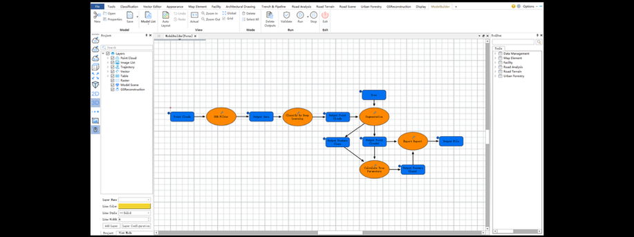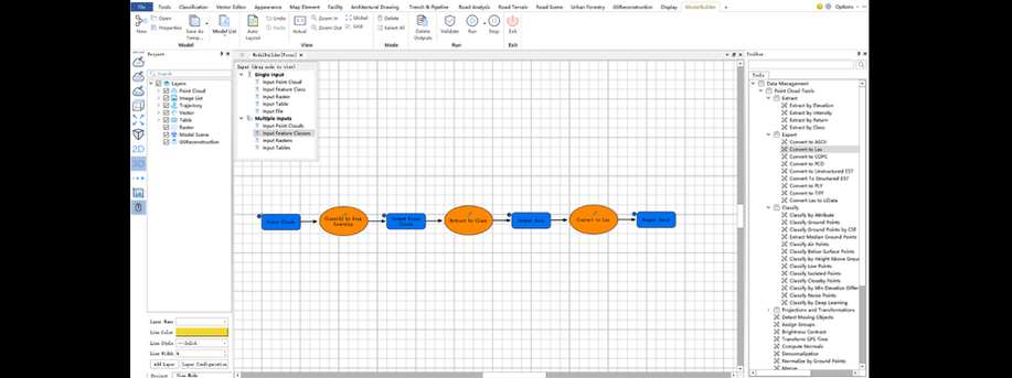 ModelBuilder offre flussi di lavoro batch personalizzabili e in un solo clic per nuvole di punti, vettori e dati raster. Il suo potente motore di cluster computing aumenta significativamente l'efficienza nella georeferenziazione, nell'elaborazione delle nuvole di punti e nella ricostruzione di modelli 3D.